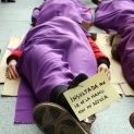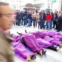 En la calle Preciados a la altura de la Puerta del Sol el Eje Feminista ha desplegado una pancarta con el lema "La violencia patriarcal nos mata a todas", mientras unas quince compañeras se tumbaron en el suelo, simbolizando las víctimas de las violencias patriarcales, representando cadáveres con mortajas violetas y etiquetas en los pies aclarando la causa de la violencia ("torturada por la talla 36", "aplastada por la carga familiar", "insultada por ir de la mano de mi novia"...).